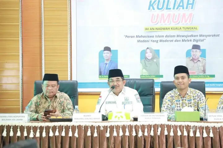 Bupati Tanjung Jabung Barat, Drs. H. Anwar Sadat, M.Ag., menghadiri sekaligus menjadi narasumber dalam Kuliah Umum Mahasiswa Institut Agama Islam (IAI) An-Nadwah Kuala Tungkal dengan tema “Mewujudkan Masyarakat Madani yang Moderat dan Melek Digital.” Acara berlangsung di Aula Kampus IAI An-Nadwah Kuala Tungkal, Rabu (3/9).