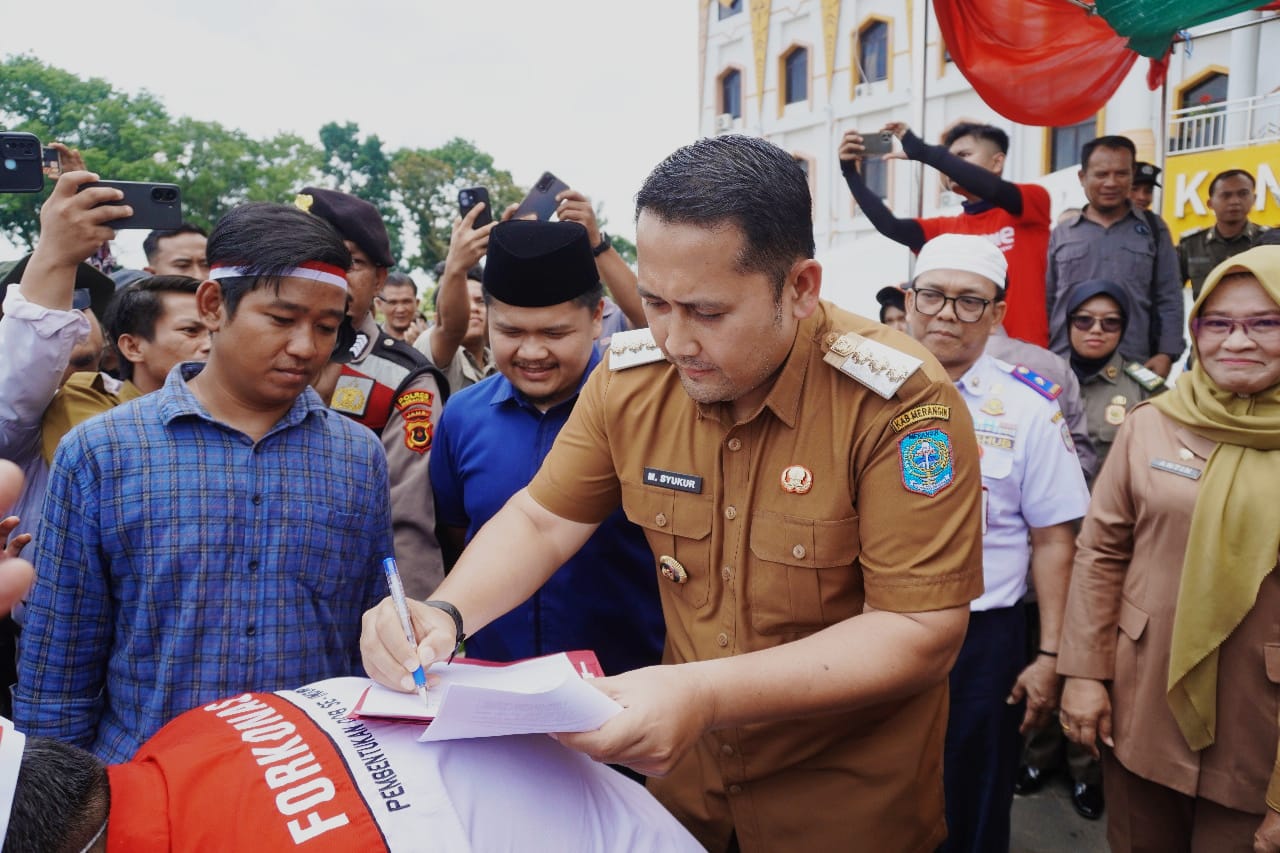 Selayangnews.id, MERANGIN – Bupati Merangin, M. Syukur didampingi Wabup, Abdul Khafidh dan Ketua DPRD Merangi, M. Rifaldi hadir ditengah ratusan massa Aksi Damai Perjuangan Rakyat Tabir Raya, Senin (3/11/2025).