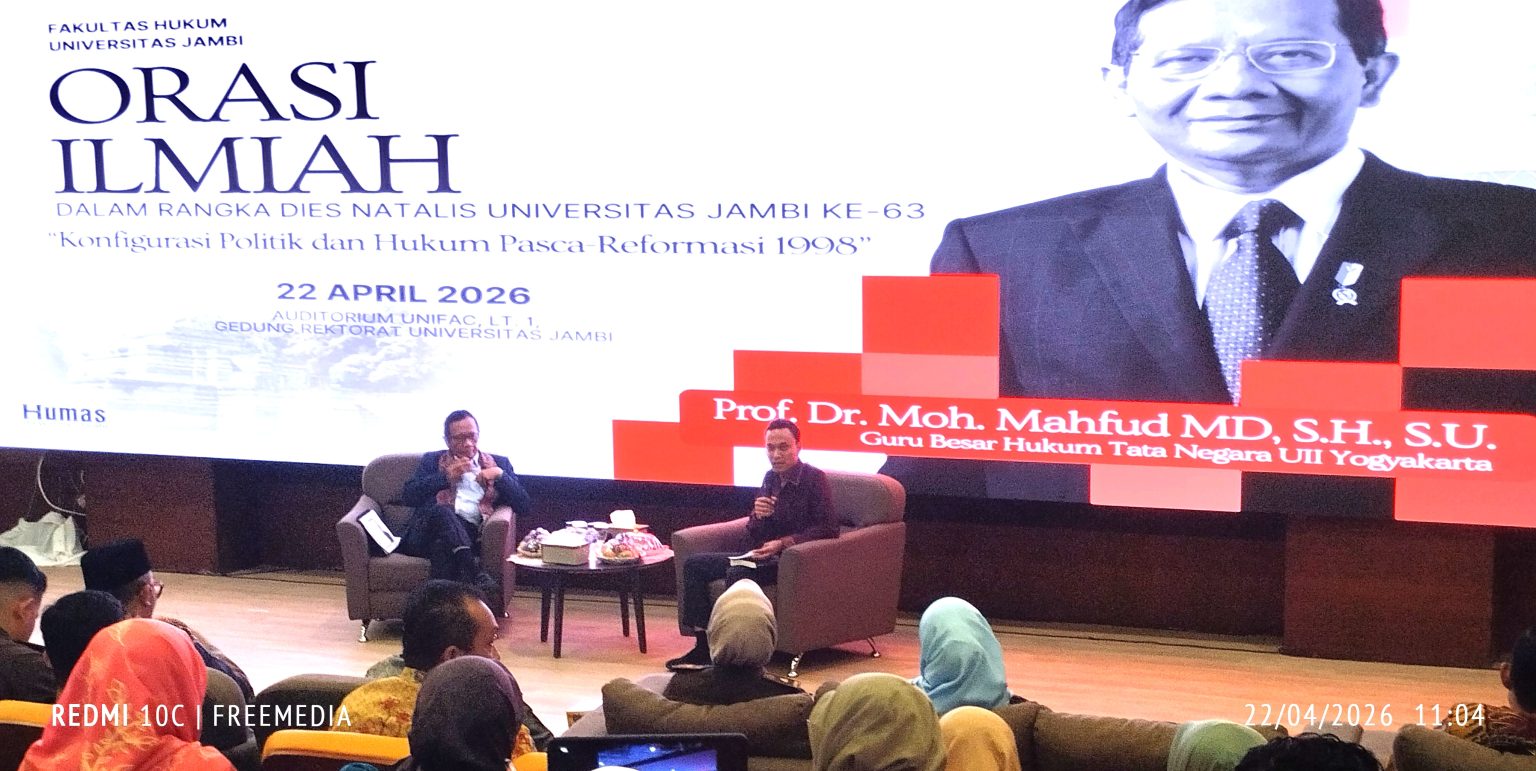 Selayangnews.id, Jambi- Fakultas Hukum Universitas Jambi menggelar orasi ilmiah dalam rangka Dies Natalis ke-63 Universitas Jambi pada Rabu, 22 April 2026. Kegiatan tersebut berlangsung di Auditorium Unifac, Lantai 1, Gedung Rektorat Universitas Jambi, dengan menghadirkan Guru Besar Hukum Tata Negara UII Yogyakarta, Moh. Mahfud MD, sebagai narasumber utama.