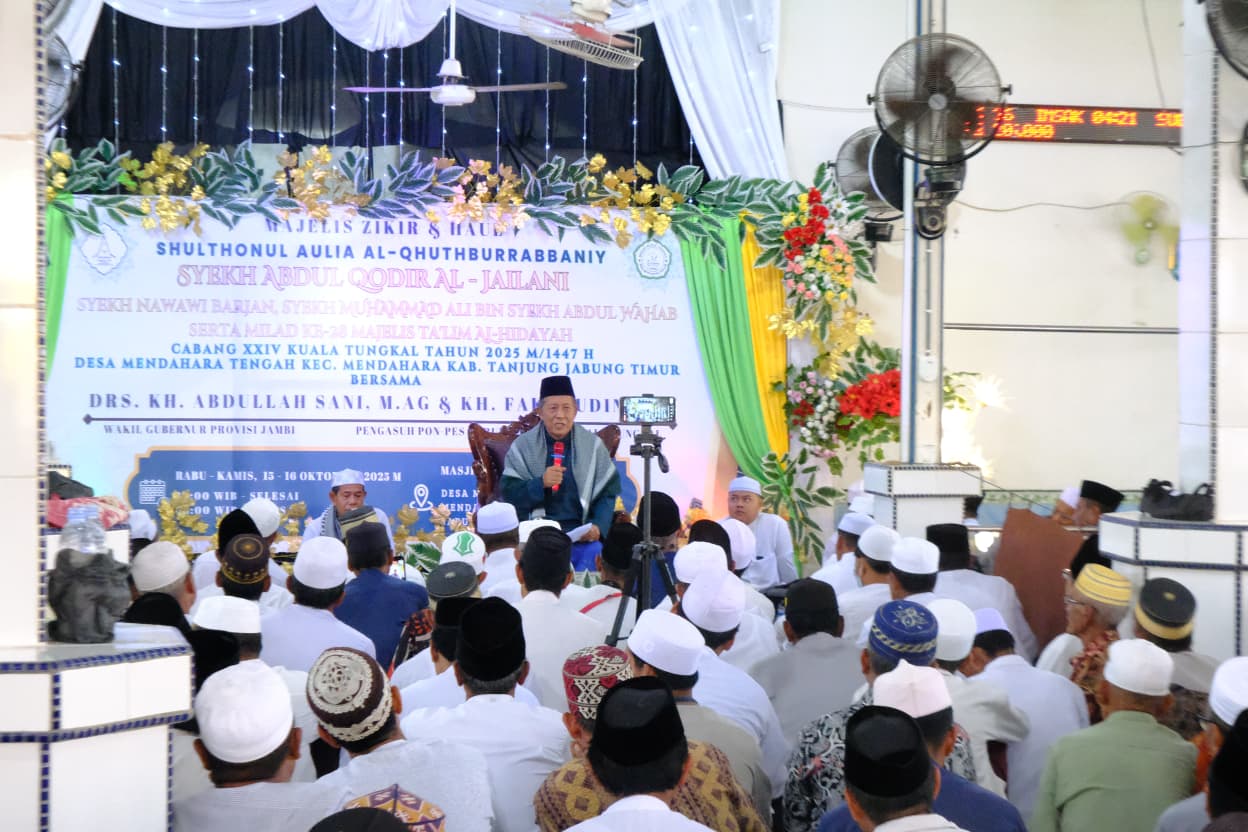 Muara Sabak- Wakil Gubernur Jambi Drs. H. Abdullah Sani, M.Pd.I menghadiri dan juga sekaligus menjadi penceramah dalam kegiatan Tabligh Akbar dalam rangka peringatan Haul Syekh Abdul Qodir Al-Jailani, Syekh Nawawi Barjan, Syekh Muhammad Ali Bin Syekh Abdul Wahab serta Milad Ke-28 Majelis Taklim Al-Hidayah yang dilaksanakan di Masjid Agung Nurul Hidayah, Desa Mendahara Tengah, Kecamatan Mendahara, Kabupaten Tanjung Jabung Timur, Kamis (16/10/2025).