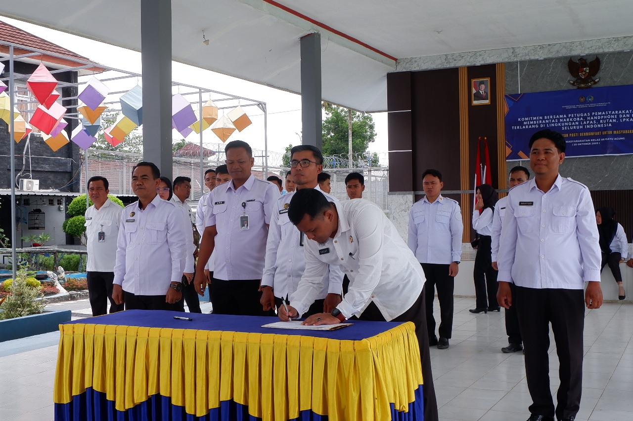 Kayu Agung – Lembaga Pemasyarakatan (Lapas) Kelas IIB Kayu Agung melaksanakan kegiatan penandatanganan komitmen bersama pemberantasan Handphone, Pungutan Liar, dan Narkoba (Halinar) di lingkungan pemasyarakatan, Senin (20/10).