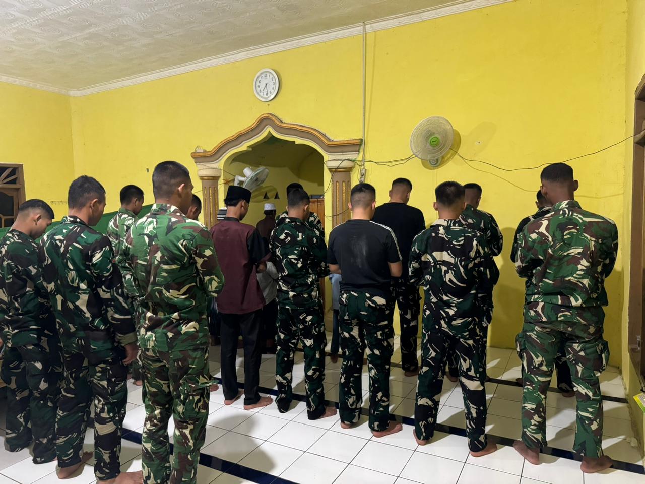 Kegiatan yang berlangsung di halaman rumah salah satu tokoh masyarakat itu terasa berbeda dari biasanya. Suara bacaan doa mengalun pelan, kadang terputus isak haru seorang nenek yang anaknya merantau dan jarang pulang. Suasana hening, hanya terdengar gumam ‘Aamiin’ yang menggema bersahutan antara seragam loreng dan kain sarung warga.